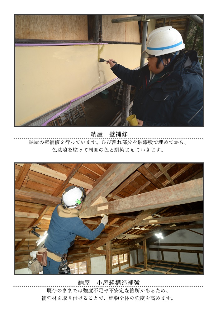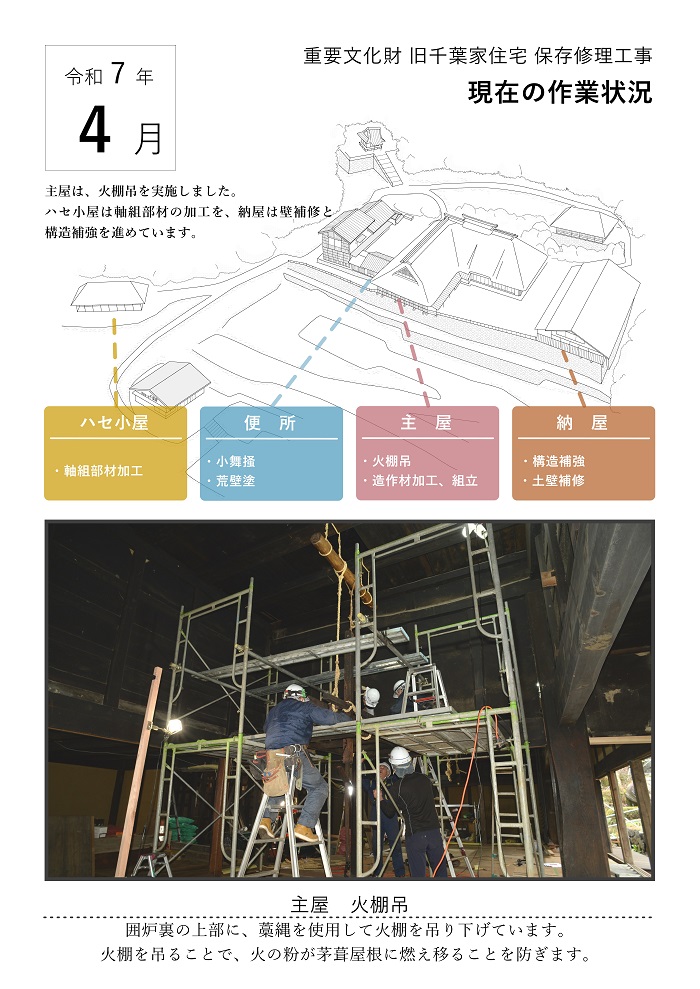 令和6年度は主屋の左官工事、造作工事、稲荷社茅葺工事、大工小屋左官工事等を行う。